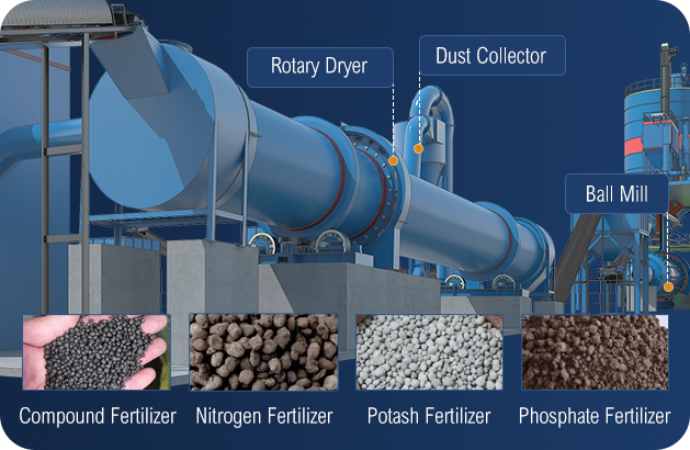 The fertilizer rotary dryer is mainly composed of a rotating body, a lifting plate, a rotating device, a supporting device, a sealing ring, etc. It has the advantages of high efficiency, large processing capacity, fast discharge, low energy consumption, and environmental protection. It can be used for drying organic fertilizers or inorganic fertilizers, effectively reducing the water content of fertilizers.